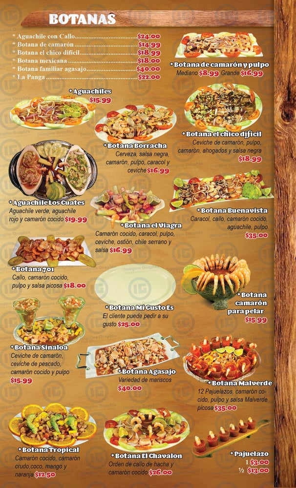 Camaron Cocido, Caracol, Pulpo,Ceviche, Ostion, Chile Serrano y Salsa. Scallops, oyster, cooked shrimp, aguachile, snail, octopus, shrimp ceviche, serrano pepper and special sauce.